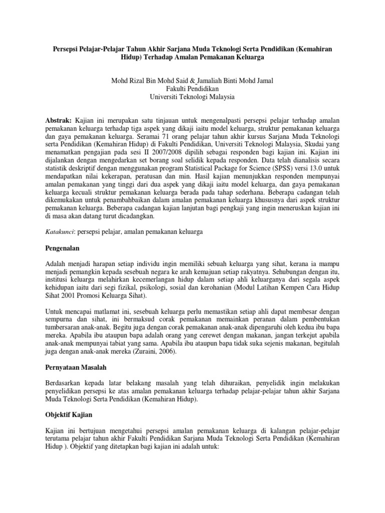 Persepsi Pelajar Pelajar Tahun Akhir Sarjana Muda Teknologi Serta Pendidikan Kemahiran Hidup Terhadap Amalan Pemakanan Keluarga
