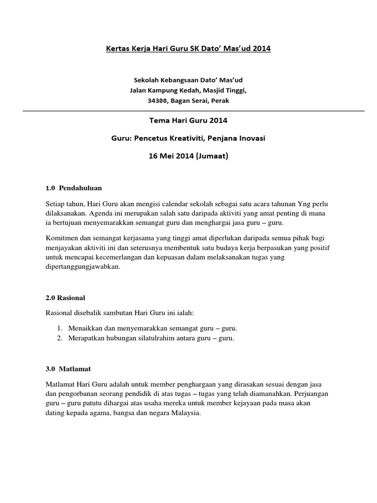 Contoh Kertas Kerja Hari Guru Peringkat Sekolah