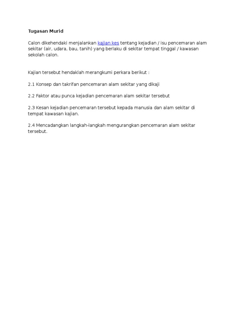 Pencemaran udara merupakan satu keadaan yang melibatkan pengenalan sebarang bahan kimia jirim zarahan atau bahan biologi yang boleh menyebabkan kemudaratan ketidakselesaan kepada manusia atau organisma hidup lain serta merosakkan alam sekitar apabila ia dibebaskan ke atmosfera contoh pencemaran udara adalah seperti gas karbon dioksida sulfur dioksida kloroflorokarbon bau bauan logam. 2 1 konsep dan takrifan pencemaran alam sekitar yang dikaji menurut kamus dewan edisi keempat 2007 pencemaran bermaksud perbuatan mencemarkan mengotorkan kebersihan alam sekeliling dengan sampah sarap dan sebagainya. Konsep dan takrifan pencemaran alam yang dikaji pilih mengikut tajuk yang anda pilih sama ada udara air atau tanih pencemaran udara. Kesan kejadian pencemaran udara kepada manusia dan alam sekitar di kawasan kajian.