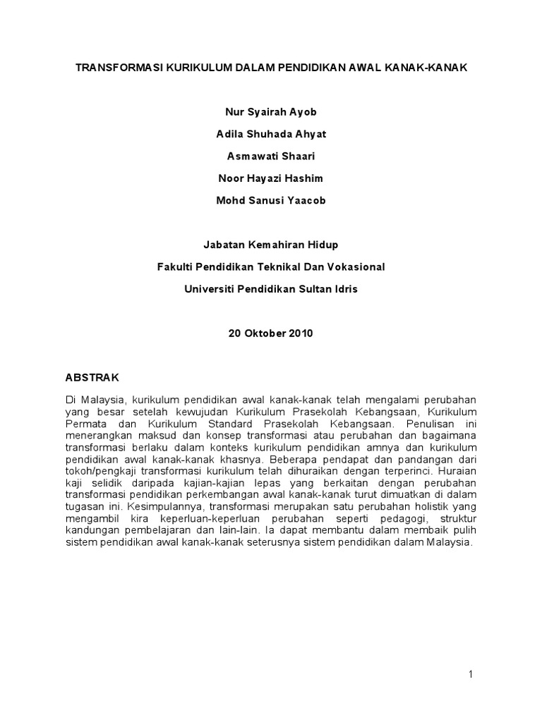 101521270 Transformasi Kurikulum Dalam Pendidikan Awal Kanak Kanak