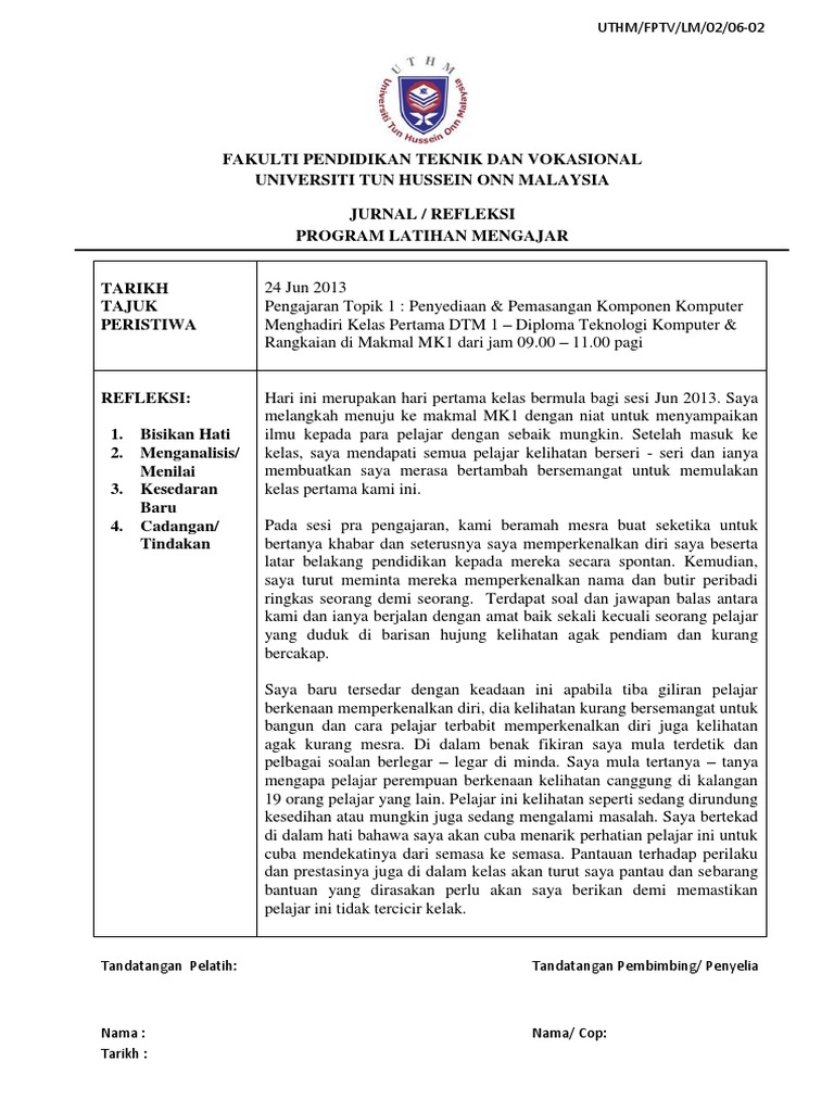 Fakulti Pendidikan Teknik Dan Vokasional Universiti Tun Hussein Onn Malaysia Jurnal Refleksi Program Latihan Mengajar