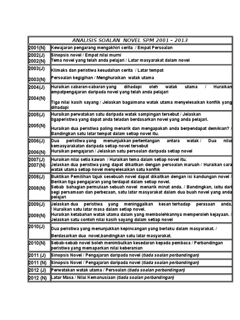 Analisis Soalan Novel 2001 2014